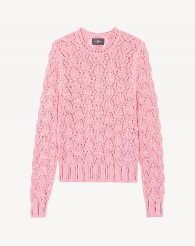 Pull à col rond en maille à motifs ajourés. Coupe droite, légèrement raccourcie. – Pull 85% coton 15% cachemire – Pull col rond femme- Coupe droite- Taillé court – Emmanchure droite- Manches longues – Tricot ajouré pointelle- Finitions pointelle à l’encolure, aux poignets et à la base